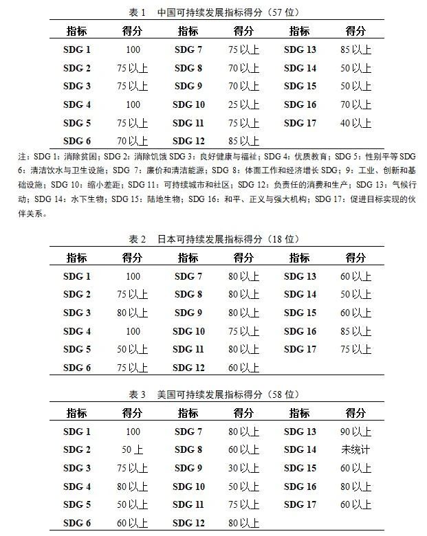 該報(bào)告計(jì)算了165個(gè)國家的可持續(xù)發(fā)展指標(biāo)得分。其中中國排名第57位。其中17個(gè)子目標(biāo)得分見表1。作為比較,日本和美國的得分分別見表2和表3。