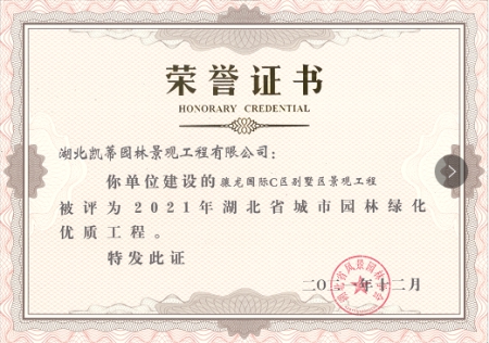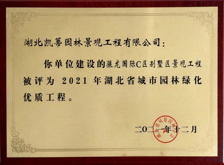 2012年12月,經(jīng)湖北省風(fēng)景園林學(xué)會(huì)專家評(píng)審委員會(huì)評(píng)定,由“湖北凱蒂園林公司”負(fù)責(zé)施工的“驤龍國(guó)際C區(qū)別墅區(qū)景觀工程”被評(píng)選為“2021年湖北省城市園林綠化優(yōu)質(zhì)工程”。