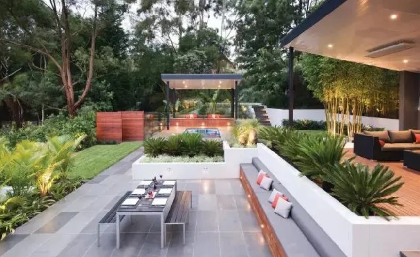 4、構(gòu)筑物:家里的庭院里有矮墻、平臺(tái)、走廊、亭子等構(gòu)筑物,但不能遮住視線,可以劃分庭院的各個(gè)空間,庭院也不會(huì)顯得狹窄,室外生活很重要,原木制作的亭子、平臺(tái)可以用于看風(fēng)景和休息。