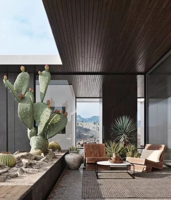除了木石和植物、桌椅家具之外,還可以在室內(nèi)與室外庭院之間,選擇使用一面大大的落地窗。對室內(nèi)而言,不僅增加了空間的采光,而且人們在室內(nèi)也可以坐看花開花落、云卷云舒,同時(shí)還不會遭受惡劣天氣的影響,烹煮一杯茶,靜享閑暇愜意的時(shí)光,感悟禪意滋味。